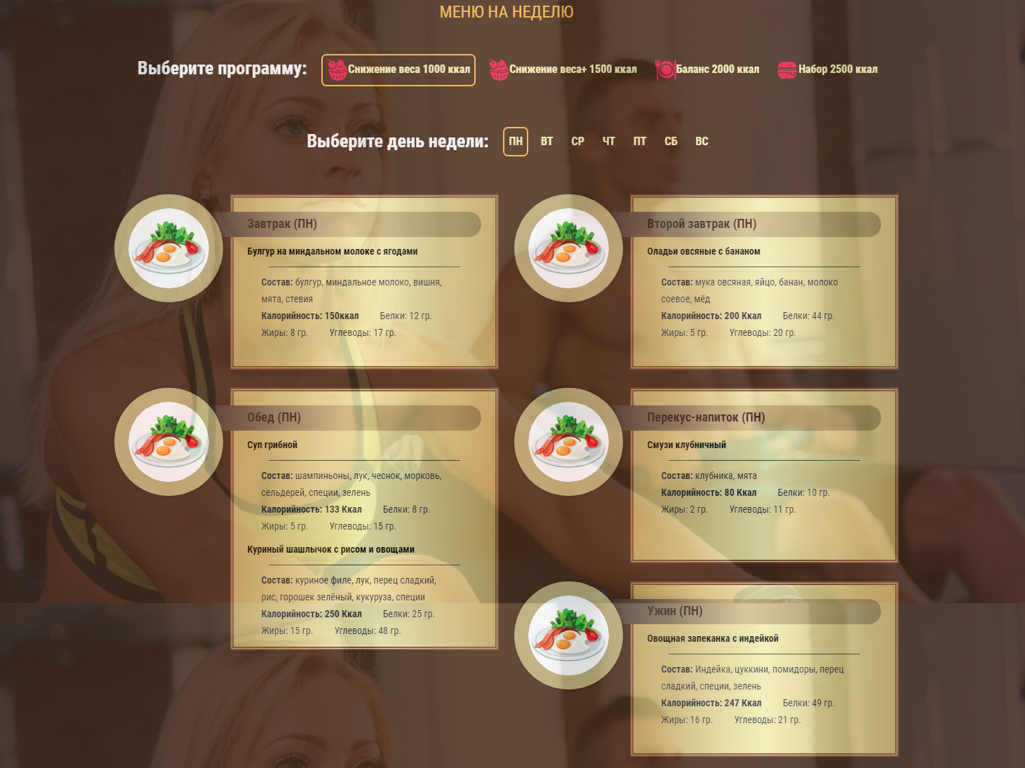 На сайте автоматизированно изменение меню на каждую неделю соглассно требованию заказчика