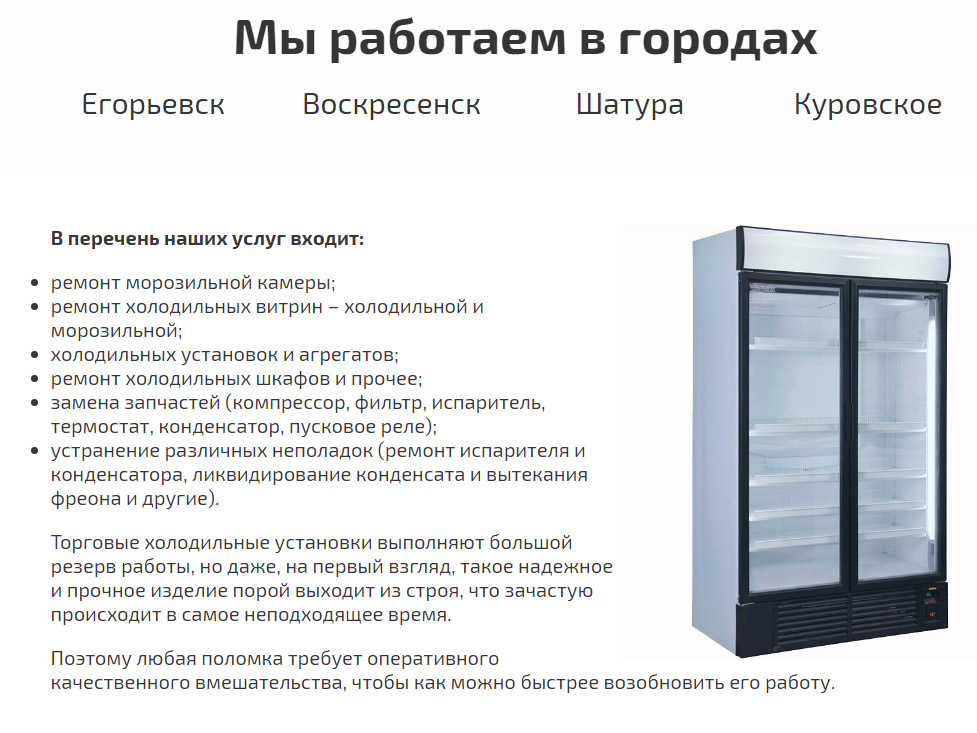 Создание сайта по ремонту холодильников в Егорьевске. Улучшение оптимизации, разработка дизайна сайта. Создание, продвижение и обслуживания сайта в Егорьевске.