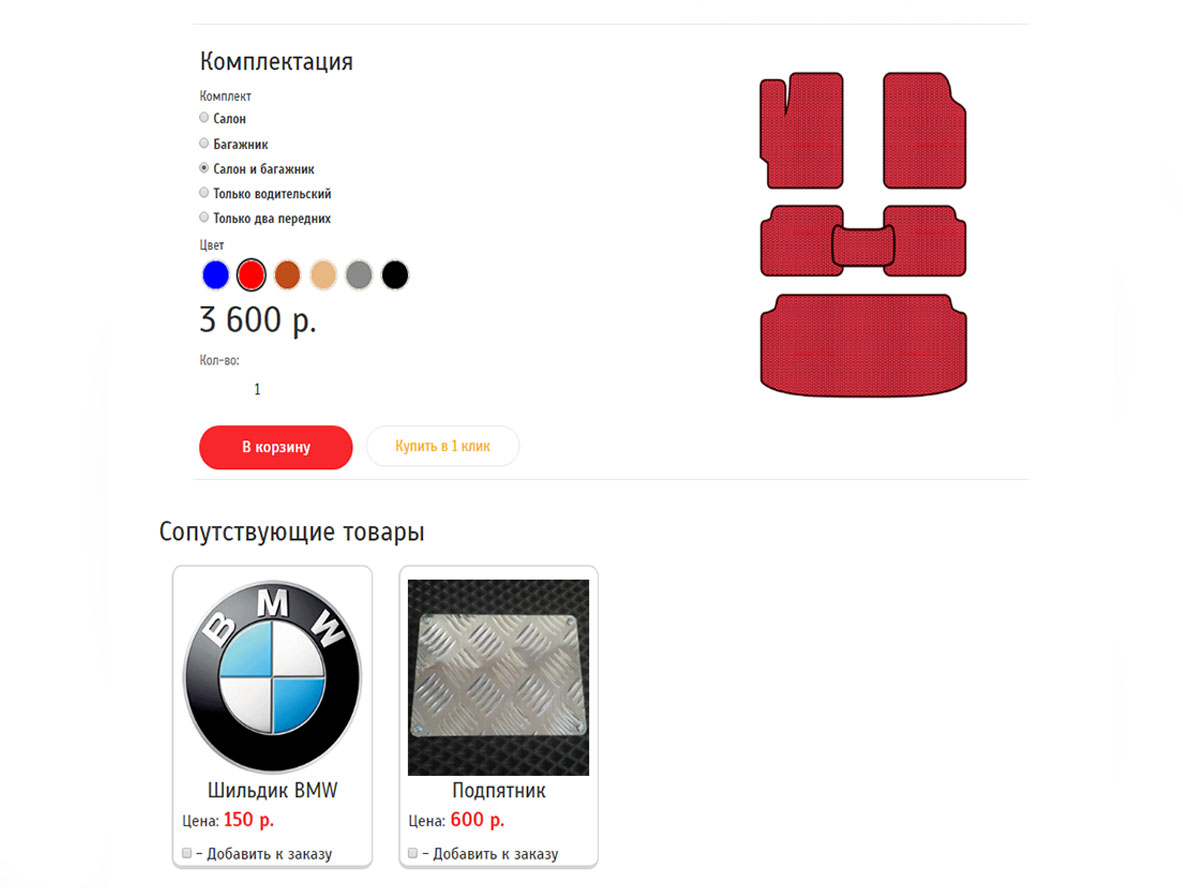 Все товары имеют свои комплектации, при выборе которых меняется фотография и цена изделия. Имеется возможность покупки сопутствующих товаров, а также настроена выгрузка в яндекс маркет.